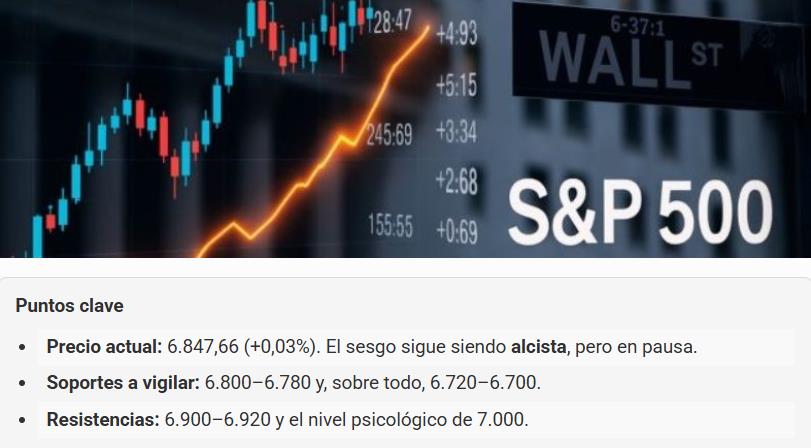 -En general, el mercado continúa consolidando la enorme ganancia desde los mínimos de abril. El nivel de 6.900 ha actuado como techo desde mediados de diciembre, limitando los intentos de subir, mientras que los compradores han entrado constantemente cerca de 6.800. Una ruptura decisiva por encima de 6.900 reafirmaría el control alcista y allanaría el camino hacia los objetivos de 7.000 y 7.200. Por el contrario, un cierre por debajo de 6.800 podría indicar una prueba de la zona de 6.700, que coincide con los mínimos de diciembre y la media móvil ascendente de 100 días.