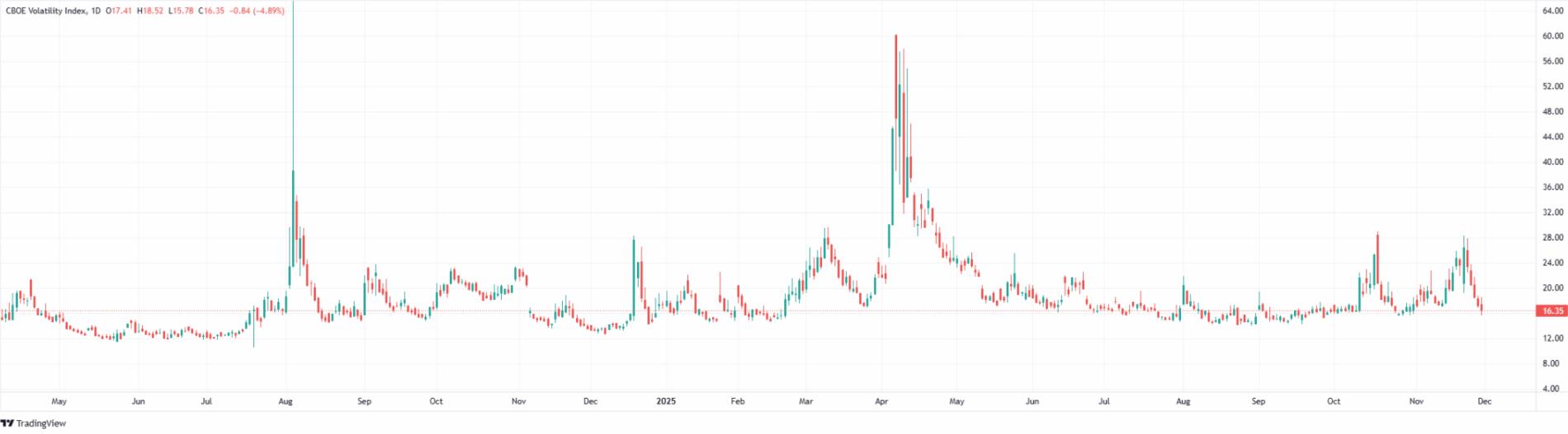 La volatilidad se ha calmado, pero no ha desaparecido, lo que indica que el pánico por la protección está disminuyendo, aunque los inversores aún no se muestren del todo complacientes. Esto es coherente con un mercado que está pasando de una corrección de advertencia a una rutina de posicionamiento de fin de año, más típica.