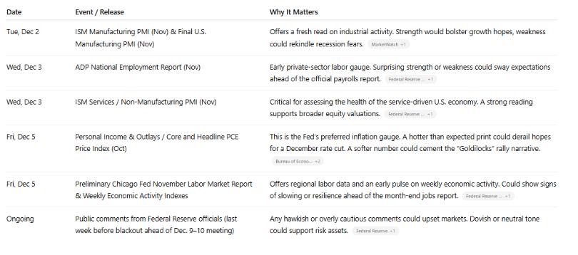 – La primera semana de diciembre reconecta a los mercados con datos económicos clave que se habían retrasado durante el reciente cierre gubernamental. La publicación de estos datos reactiva los fundamentales de la dirección del mercado. Unos pocos datos positivos —sobre inflación, empleo, manufactura o servicios— podrían confirmar una narrativa alcista de fin de año. Por el contrario, cualquier debilidad sorpresiva podría desbaratar el optimismo actual. Los datos de inflación son especialmente sensibles, y se espera que la próxima publicación del PCE moldee las expectativas del mercado antes de la próxima reunión de la Fed del 9 al 10 de diciembre.