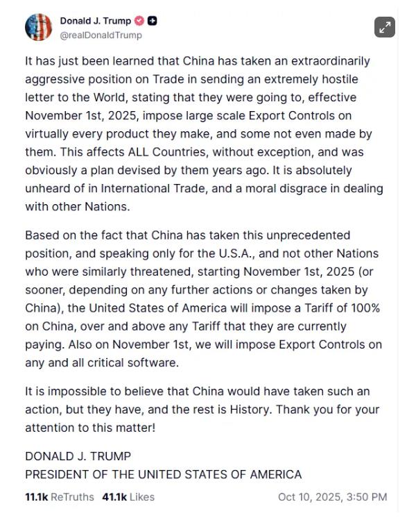 -Las acciones cayeron con fuerza el viernes debido a una estrategia defensiva, la tensión geopolítica, la retórica comercial y la disfunción política, que provocaron un brusco cambio de actitud. Tras cotizar relativamente plano la mayor parte de la semana, el S&P 500 cayó un 2,7% el viernes, revirtiendo las ganancias previas y cerrando la semana en números rojos. La ola de ventas al final de la jornada fue provocada por los inesperados comentarios del presidente Donald Trump, incluyendo aranceles del 100% y controles a las exportaciones Chinas.