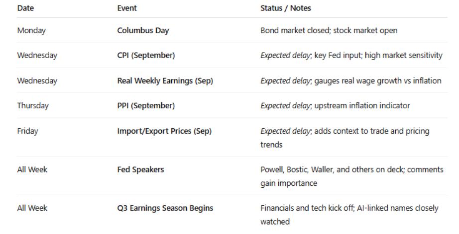-Al mismo tiempo, el cierre gubernamental continuó en su segunda semana, sin indicios visibles de resolución. Las agencias comenzaron a suspender a empleados y a retrasar servicios esenciales, y, lo más importante para los mercados, esto incluye la suspensión continua de la publicación de datos económicos clave.